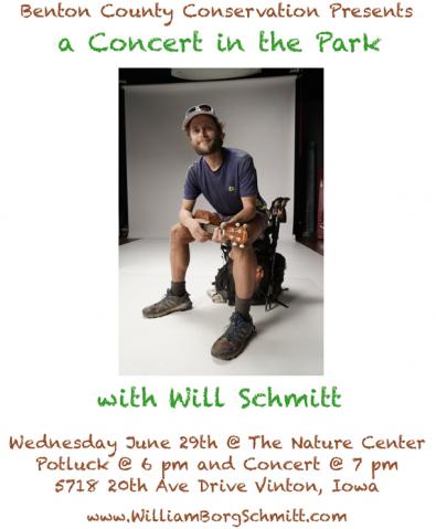 Will Schmitt will perform a free "Spirit of Chautauqua" concert on Wednesday, June 29, at the Benton County Nature Center, 5718 20th Avenue Drive, just west of Rodgers Park northwest of Vinton.