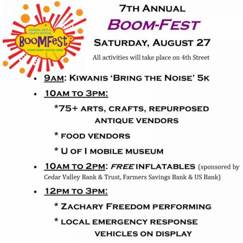 More than 75 vendors have signed up for the annual Boomfest in downtown Vinton on Saturday, Aug. 27. The booths will be open from 10 a.m. to 2 p.m. along 4th Street.