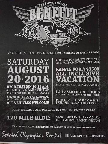 The 7th Annual Vinton-Shellsburg United (VSU) Special Olympics Benefit Ride is set for Saturday, Aug. 20, in Vinton.