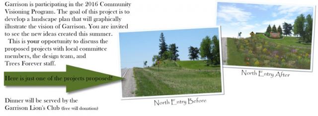 On Monday, August 29th, from 5pm to 7pm, Meg Flenker from Flenker Land Architecture Consultants, Trees Forever Field Coordinator Patty Reisinger, and members of the Garrison Community Visioning Committee will be available to answer questions regarding these designs. The viewing is set to take place at the Garrison library, during the Farmer’s Market. Display will be outside if weather permits.