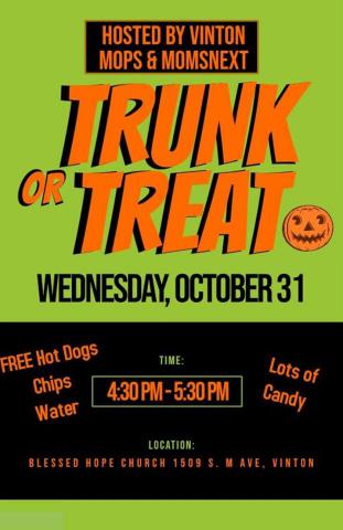 The annual Trunk or Treat event provided by the area MOPS (Mothers of Preschoolers) group, will be held at the Blessed Hope Church, located behind Theisen's, on Wednesday, October 31st, from 4:30-5:30 p.m. Children are invited to start their evening at the church parking lot.