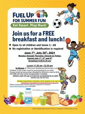 Vinton-Shellsburg Community School District (VSCSD) will be offering complimentary breakfast and lunch to all children and teens, ages 1-18, in both the Tilford and Shellsburg Elementary school lunchrooms this summer. No registration or identification is required. Children five and under must be accompanied by an adult. Anyone over the age of 19 may purchase a breakfast meal for $2 and a lunch meal for $3.