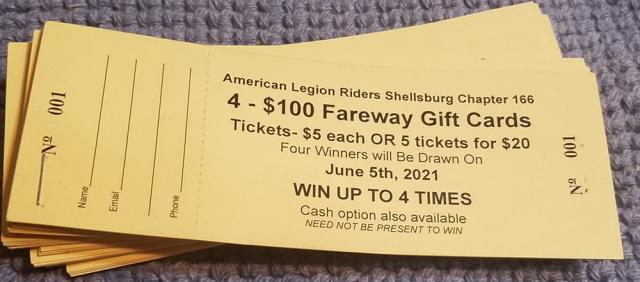There will also be four winning raffle tickets drawn for a chance to win one or four $100 Fareway Gift Cards. You can win one or four! Ticket prices are 1 for $5 or 5 for $20. Winners will be drawn on the 5th. If you would like to obtain tickets, contact the legion through their Facebook page.
