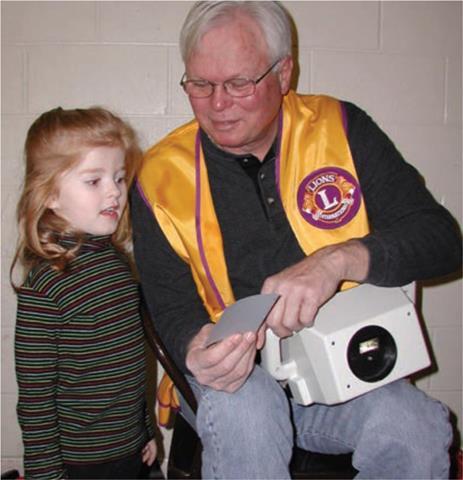 Caption: Trained in using a special camera, Vinton Lions members for decades have provided a valuable free service to help identify possible visual problems in young children. Sight-saving and help to visually impaired is a Lions' priority.