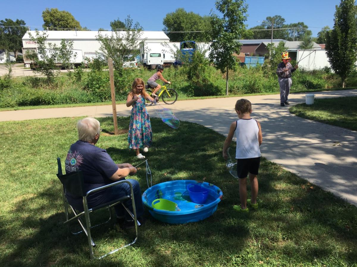 An estimated 35 visitors toured the 1850s Strait Log Cabin, watched wood carving and needlework demonstrations, got their portrait sketched, or tried their hand at giant bubble making, hoop rolling, corn shelling, rope making or washing on a washboard. The Depot Museum was also open, featuring railroad and school exhibits and the restored player piano.