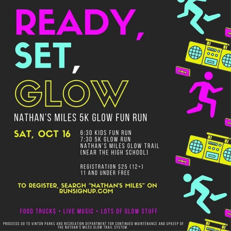 All are welcome! Opal & Hazel Pizza & the Lions trailer will be there too! Nathan's Miles glow trail is getting a lot of use in its first season! Vinton has drawn media attention from around the state, country and world because of it. It's being used day and night by residents, visitors, young and old, solo walkers and family bikers! The family is excited to celebrate the trail and remember the amazing man that the trail is named after! Register today! https://runsignup.com/.../Vinton/2021NathansMilesGlowFunRun