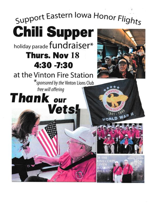 There will be a chili supper fundraiser for the Eastern Iowa Honor Flights on Thursday November 18 following the Christmas Parade. The supper will be served from 4:30-7:30 p.m. at the Vinton Fire Station, sponsored by the Vinton Lions Club.