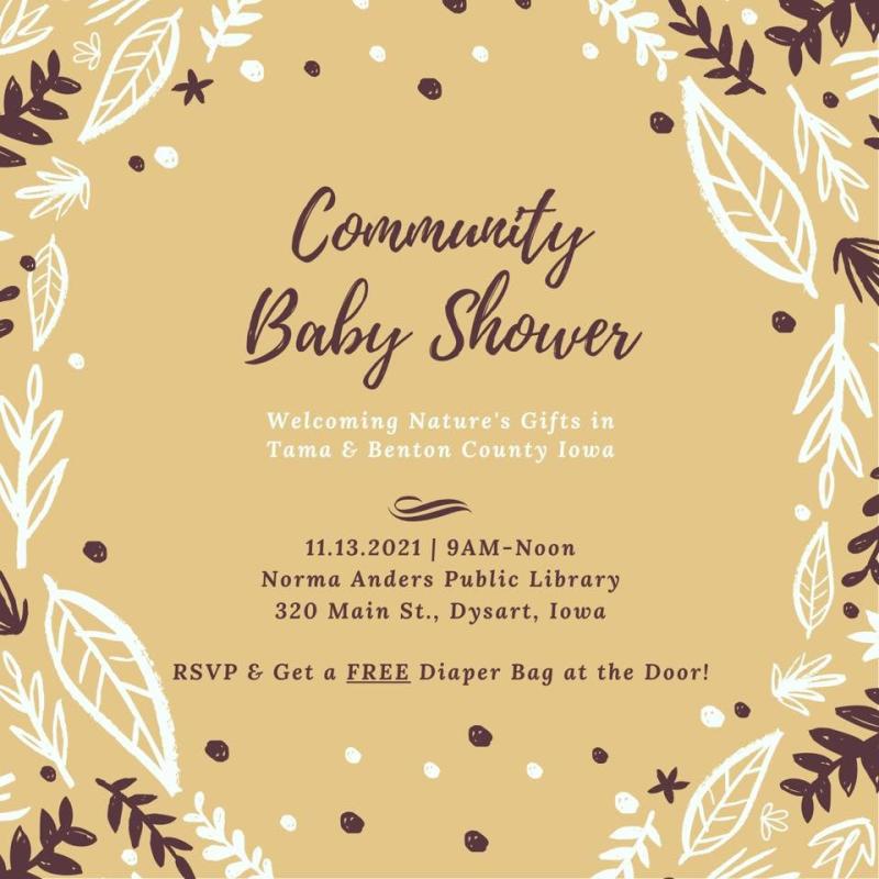 The shower will be held 11/13/21 from 9AM - Noon at the Norma Anders Library in Dysart. Any expecting moms that would like to attend will need to fill out this survey and that guarantees them entry and a Free diaper bag: https://forms.gle/E6CLnveaP5GZZzET6