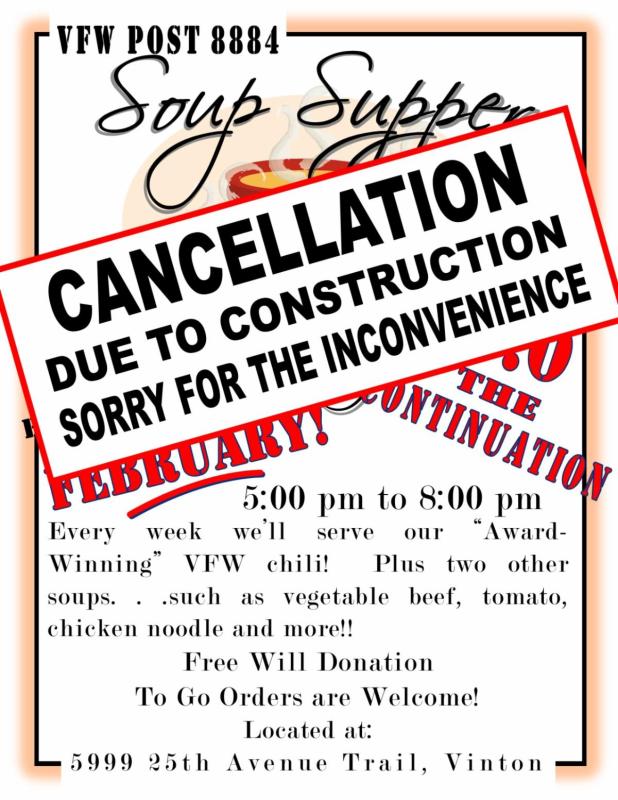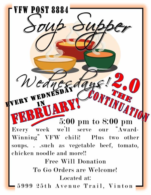 The VFW Post 8884 will continue to host Soup Supper Wednesdays every Wednesday in February. Soup will be served from 5-8:00 p.m.