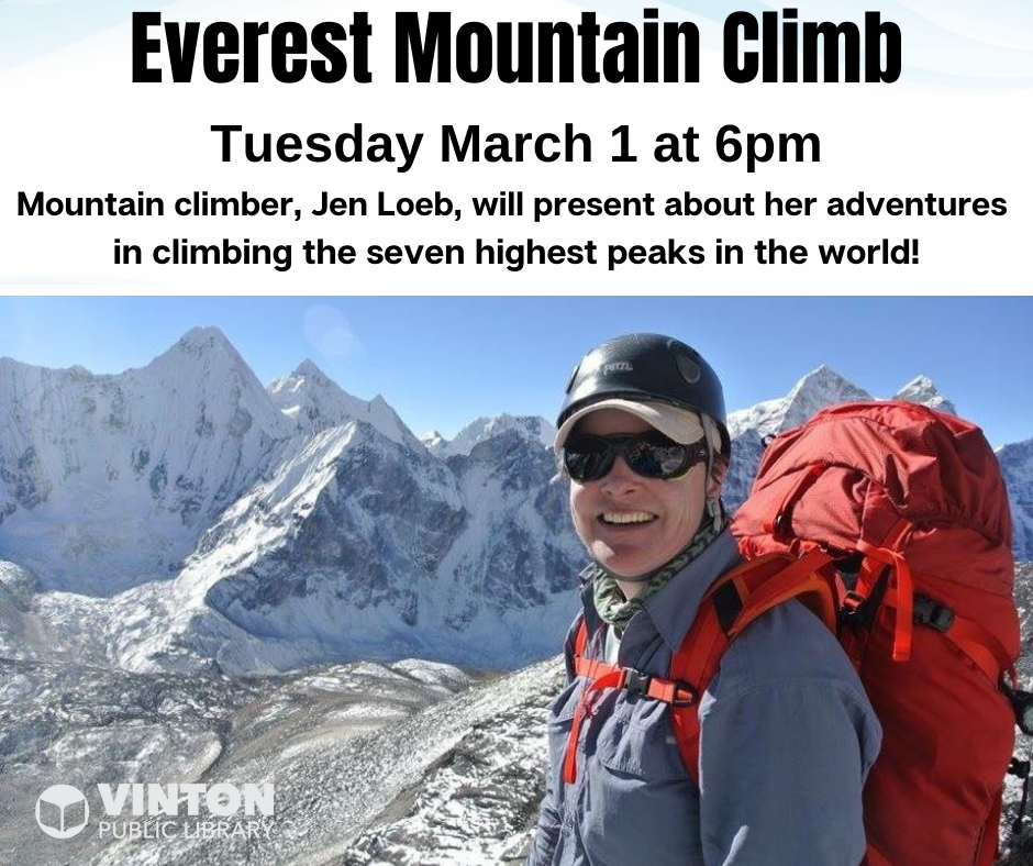 On Tuesday, March 1, mountain climber, Jen Loeb, will share a presentation about her adventures climbing the seven highest peaks in the world!