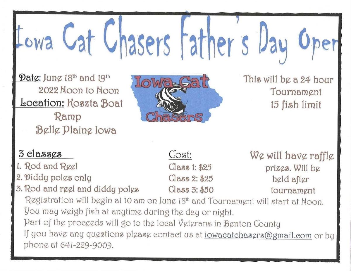 The Iowa Cat Chasers will hold a Father's day Open on June 18-19 from noon until noon at the Koszia Boat Ramp in Belle Plaine.