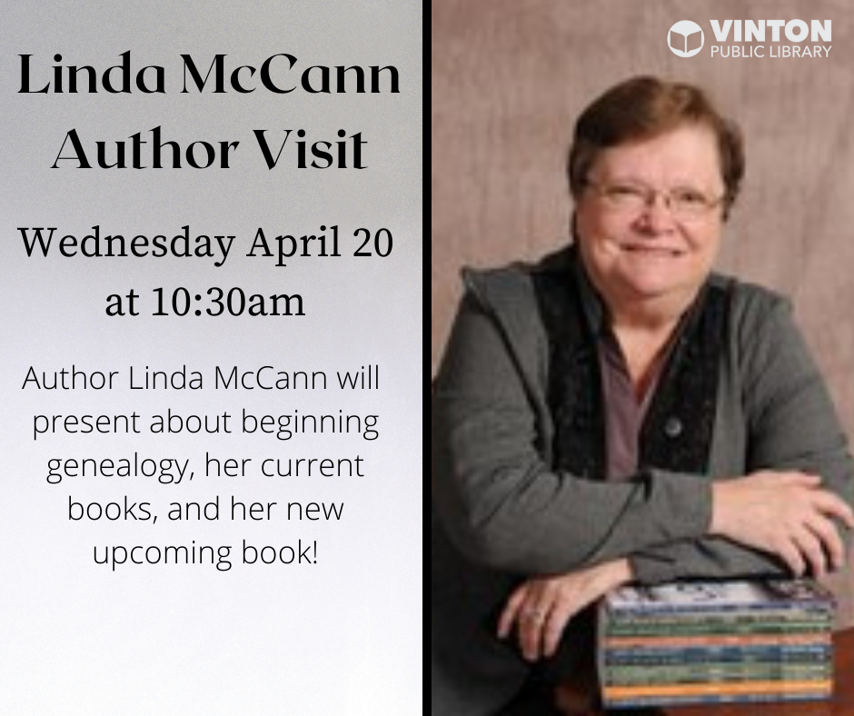 Author Linda McCann will visit the Vinton Public Library on Wednesday, April 20 at 10:30 am.