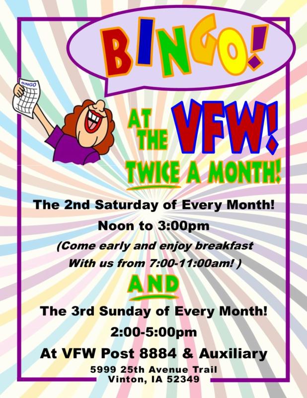 The VFW Post #8884 will hold Bingo games two times during the month. The first will be on the 2nd Saturday from Noon until 3:00 p.m. (be sure to come early and enjoy breakfast from 7-11:00 a.m.)