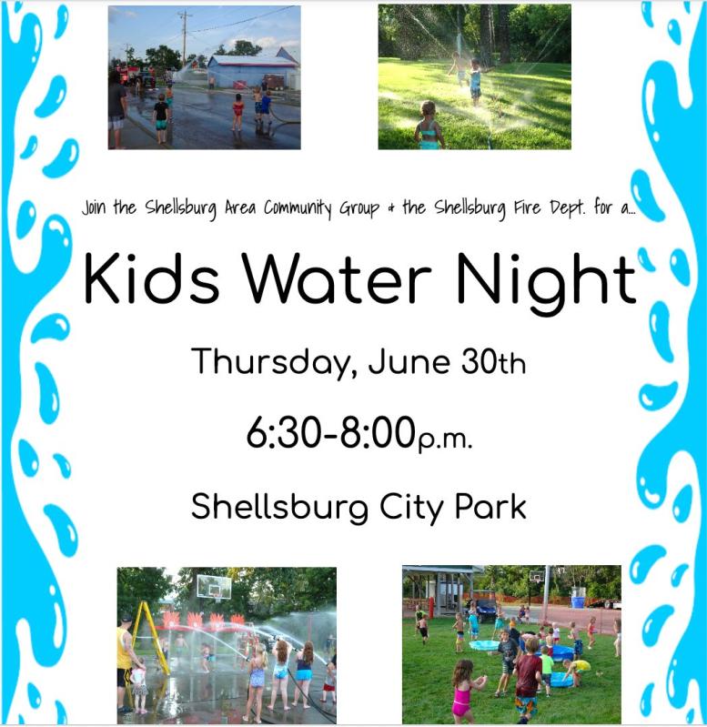 The Kids' Water Night will be held on Thursday, June 30 from 6:30-8:00 p.m. at the Shellsburg City Park.