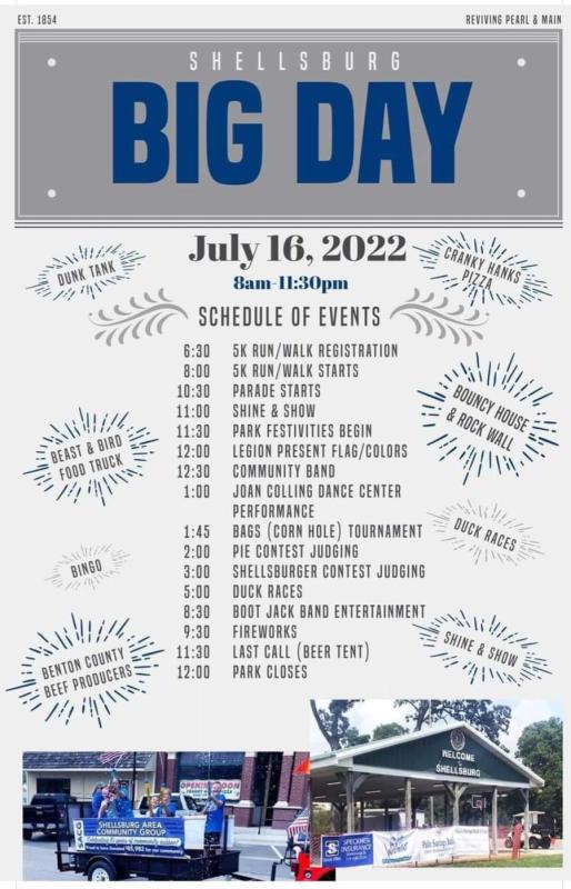 Shellsburg's Big Day is scheduled for Saturday, July 16 beginning at 8:00 a.m. and running through 11:30 p.m. with events for all ages.