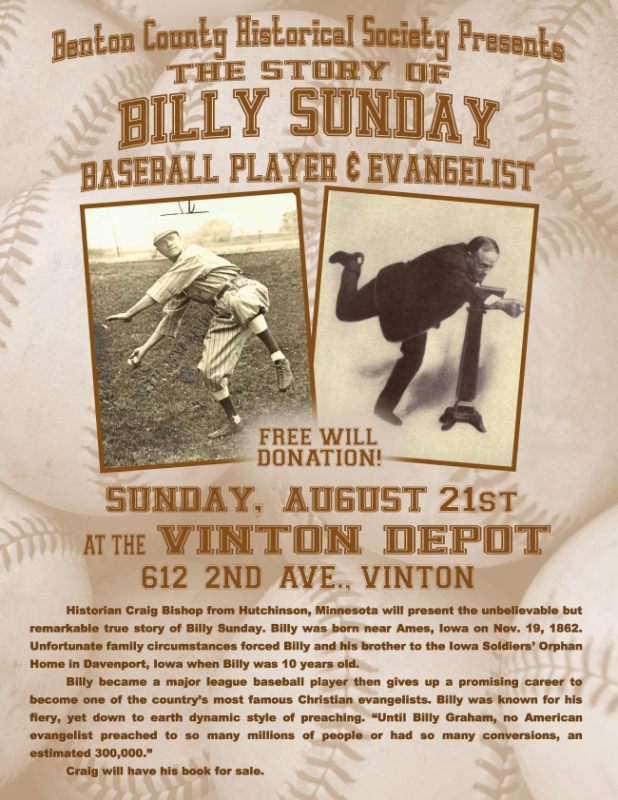 The Benton County Society will host guest presenter historian Craig Bishop of Hutchinson, Minnesota. He will present the unbelievable but remarkable true story of Billy Sunday. The event will take place at the Vinton Depot on Sunday, August 21 beginning at 1:00 p.m. The depot is located at 612 2nd Ave. in Vinton.