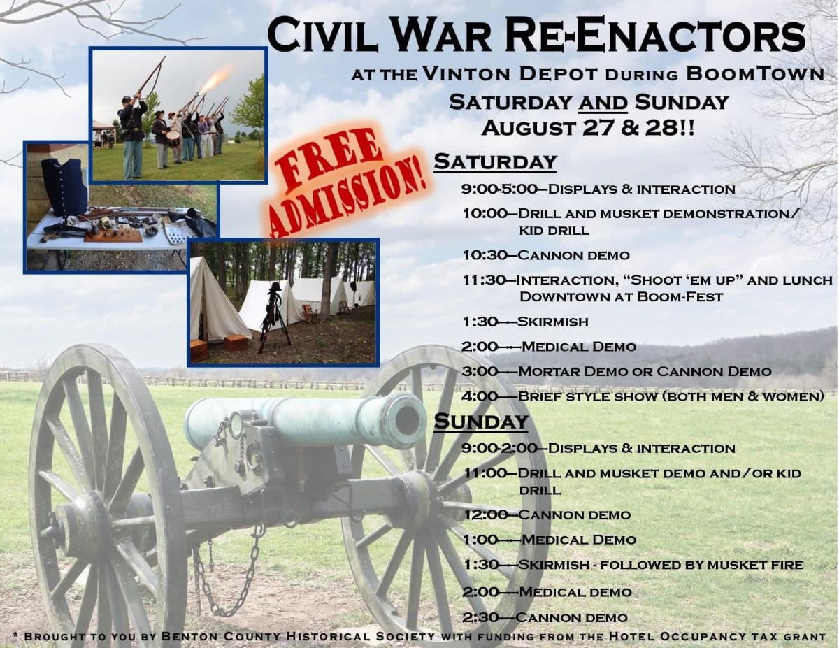 Civil War Re-Enactors will be at the Vinton Train Depot this weekend during the Boomtown events Saturday-Sunday August 28-29.