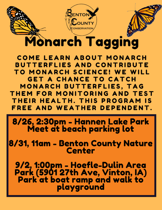 Come learn about Monarch butterflies and contribute to Monarch science. We will get a chance to catch Monarch butterflies and tag them for monitoring and test their health. This program is free and weather dependent.
