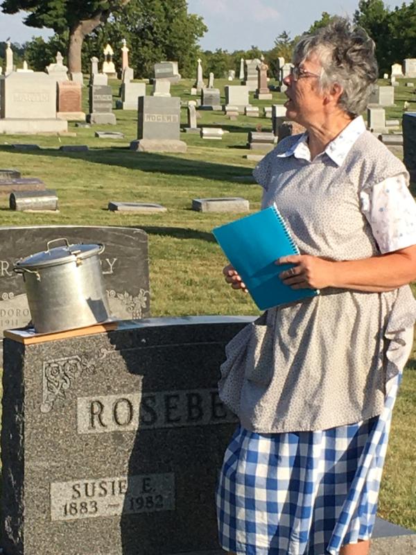 Carolyn Roseberry in last year’s Center Point Cemetery Walk, plays her grandmother Susie Roseberry (1883-1982.) Susie, like many farm wives of her day, made oodles of noodles. She left a big noodle kettle to fill—and it now belongs to Carolyn.