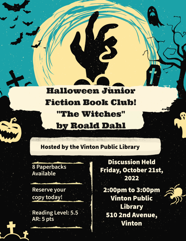 The Vinton Public Library will hold a Halloween Junior Fiction Book Club featuring the book "The Witches," by Roald Dahl.