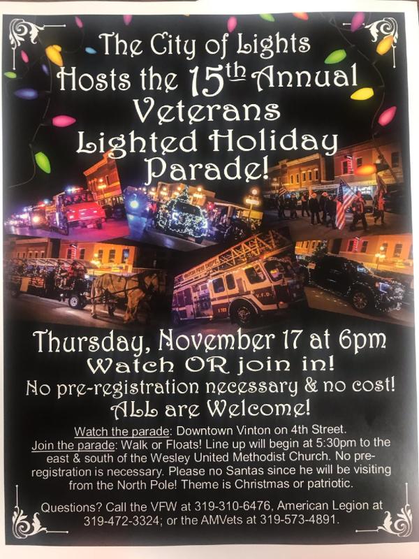 The local Veteran groups will host the Lighted Holiday Parade on Thursday evening, November 17 in downtown Vinton. This year will mark the 15th year for the parade.