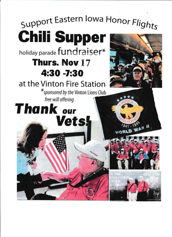 The annual Vinton Lions Club Chili Supper will be held next Thursday, to support Eastern Iowa Honor Flights. Make plans on November 17 from 4:30-7:30 p.m. to stop at the Vinton Fire Station before or after the Christmas parade!