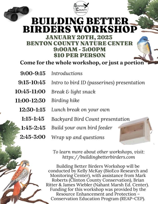 Benton County Conservation will be offering a workshop about birds. The class will be held on January 20, 2023 at the Beneton County Nature Center located at 5718 20th Ave. Dr., Vinton. The class begins at 9:00 a.m. and will run until 3:00 p.m. Cost is $10 per person. Come for the whole workshop or just a portion!