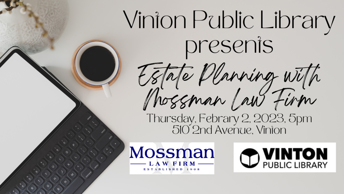 The Vinton Public Library will host an Estate Planning session with the Mossman Law Firm. The event will take place on Thursday, February 2. The session will begin at 5:00 p.m.