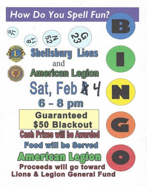 The Shellsburg Lions will hold Bingo at the Shellsburg Legion on Saturday, February 4. This is a make up game from the January 28th weather postponement.
