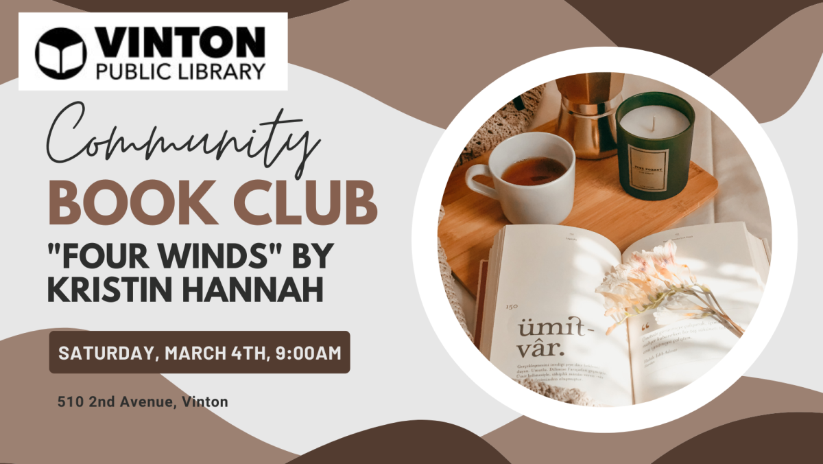 The Vinton Public Library will be hosting a community book club discussing the book, "Four Winds" by Kristin Hannah. The event will be held on Saturday, March 4th beginning at 9:00 a.m.