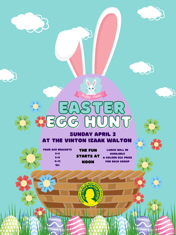 The Izaak Walton League in Vinton will host an Easter Egg Hunt for children on April 2 beginning at 12:00 p.m.