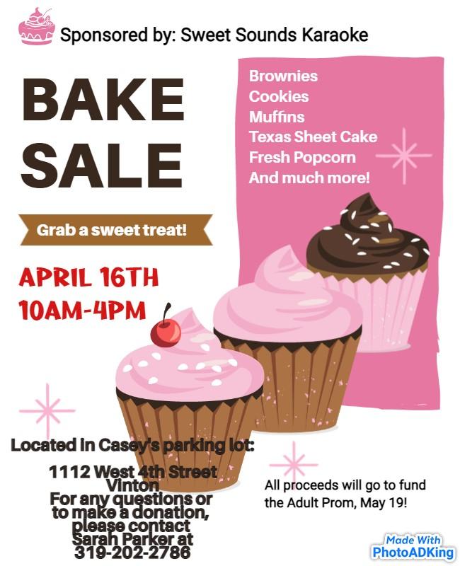 There will be a bake sale on Sunday, April 16th from 10:00 a.m. to 4:00 p.m. at the Casey's parking lot located at 1112 West 4th St. in Vinton.