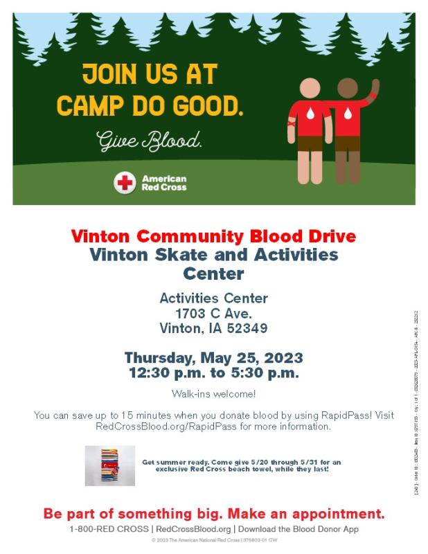 The Vinton Community Blood Drive will be held at the Vinton Skate & Activities Center located at 1703 C Ave. in Vinton.