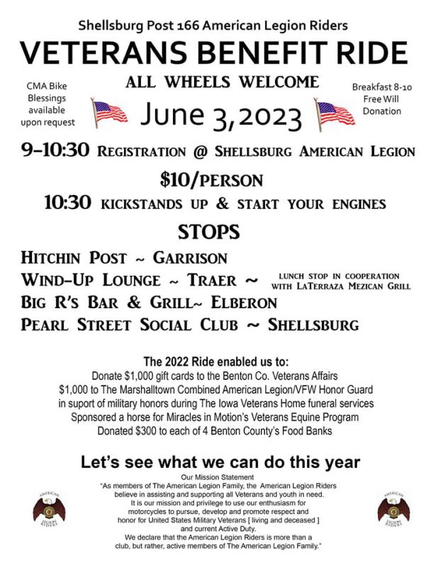 Shellsburg Post 166 American Legion Riders will hold the Veterans Benefit Ride on Saturday, June 3. You can grab some breakfast at the Legion for a freewill donation from 8-10 a.m.