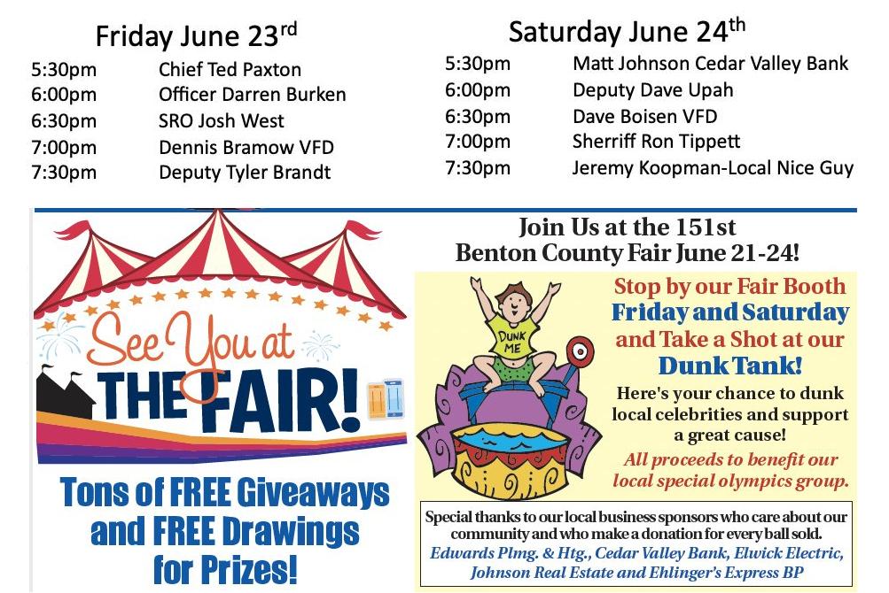 Make sure to mark your calendars and make sure to visit our booth this Friday and Saturday between 5:30-7:30 pm and purchase a few balls to dunk someone for a great cause!