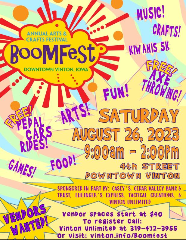 For more information about Boom-fest, call the Vinton Unlimited office at 319-472-3955 or email melody@vintonia.org