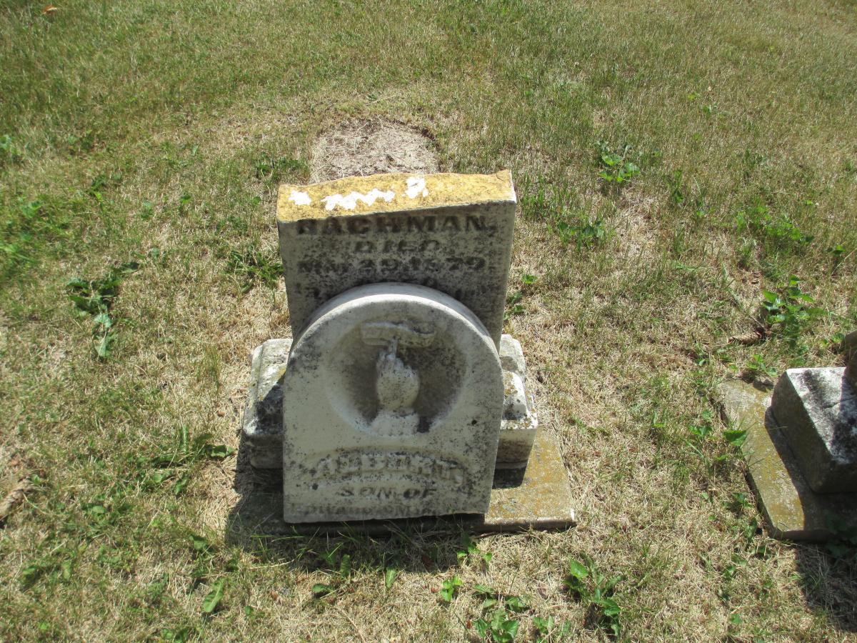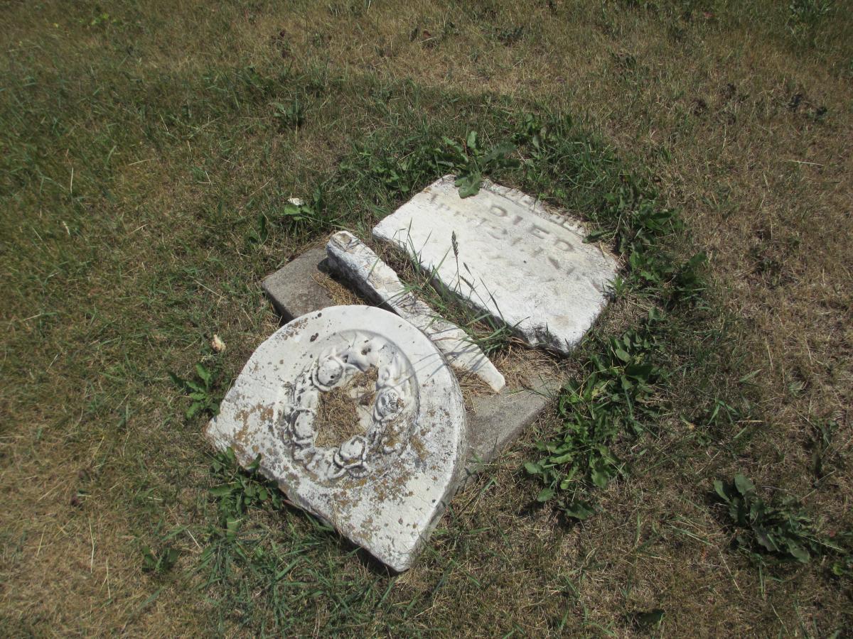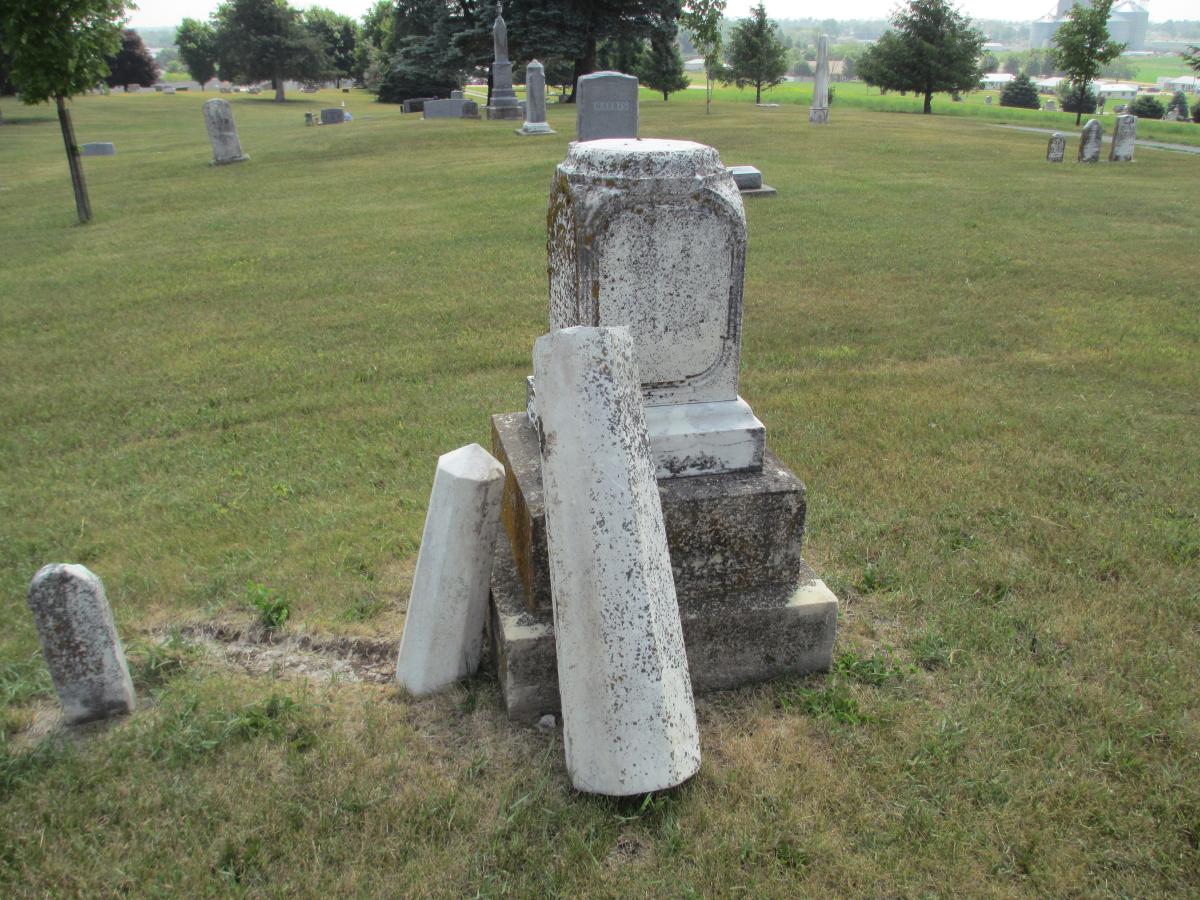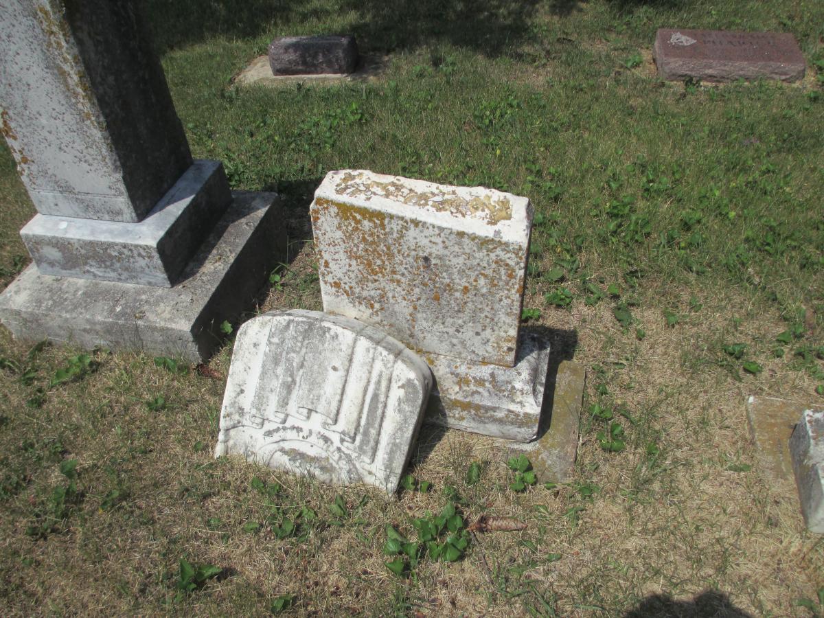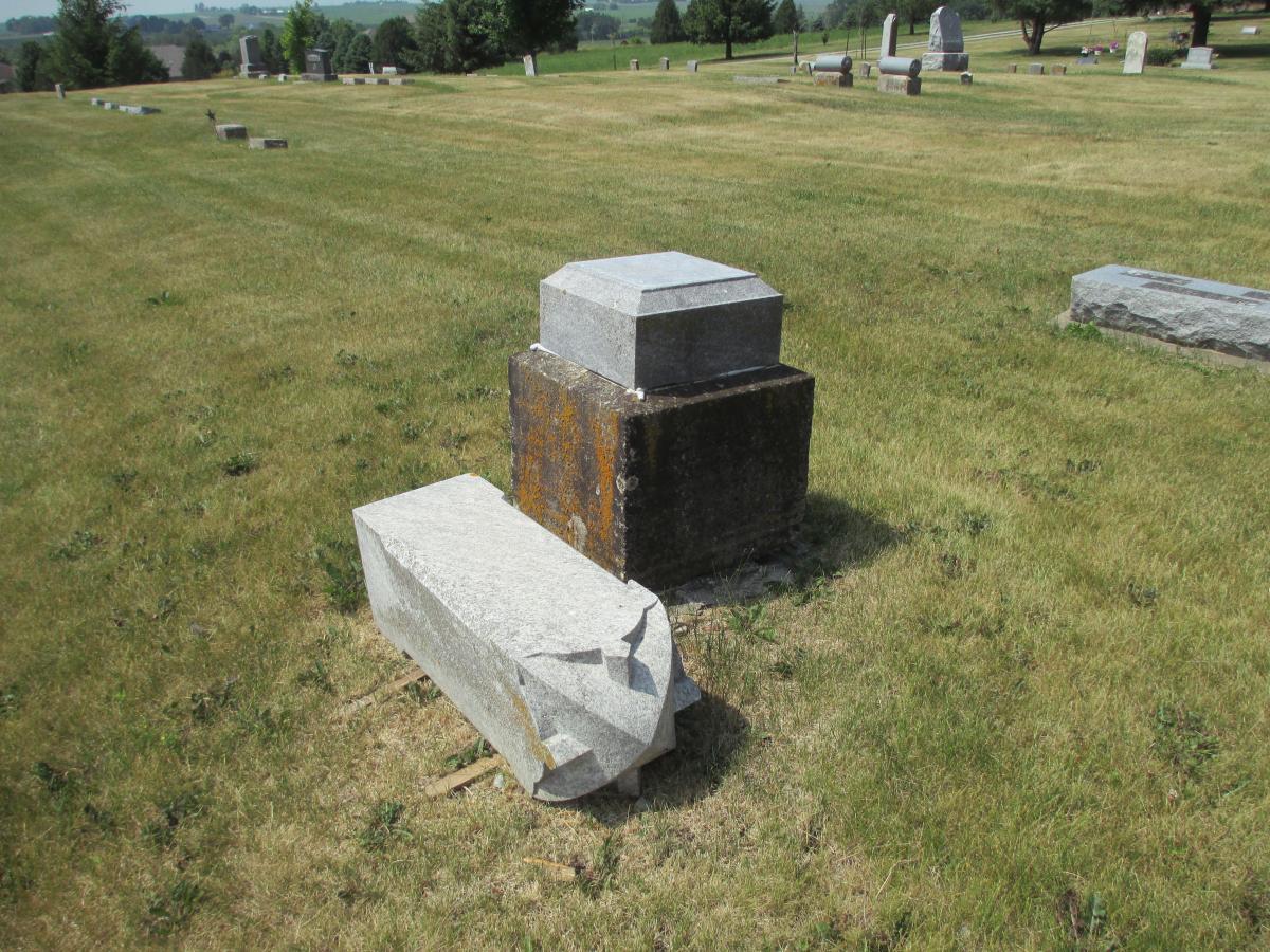 On March 5, 2022, an EF1 tornado struck Vinton’s west side. A month later, crews from Lewiston Monument Company in Lewiston, Minnesota were on-scene to reset many of the toppled monuments at the request of Vinton Monuments. Remnants of the tornado can still be seen in the cemetery as many of the markers and monuments were severely damaged in the storm.