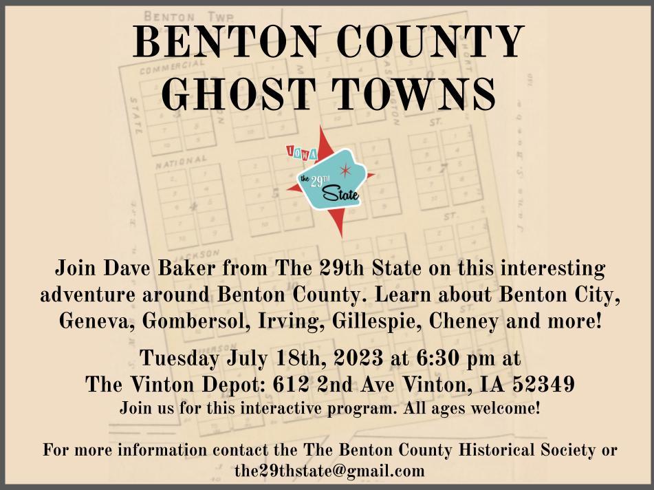 Dave Baker the writer, photographer, and historan of the Iowa blog, "The 29th State." Baker will lead us on an interesting adventure through the history of Benton County to learn about many of the former towns of the county. Discover the histories of Benton City, Geneva, Gombersol, Irving, Gillespie, Cheney, and more!
