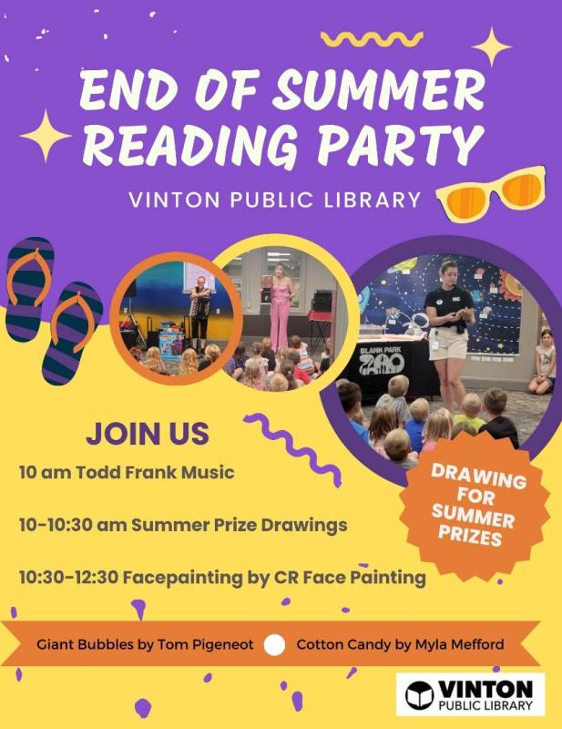 On Friday, August 4, beginning at 10:00 am, the Vinton Public Library will host an "End of Summer Reading Party!"