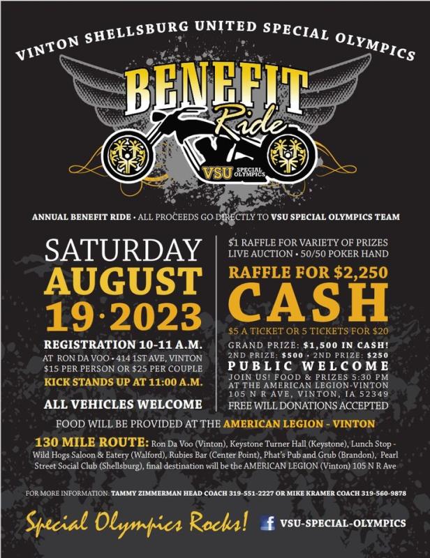 Mark your calendars for Saturday, August 19, 2023, for our annual benefit ride to support our local Vinton Shellsburg United Special Olympics Team!