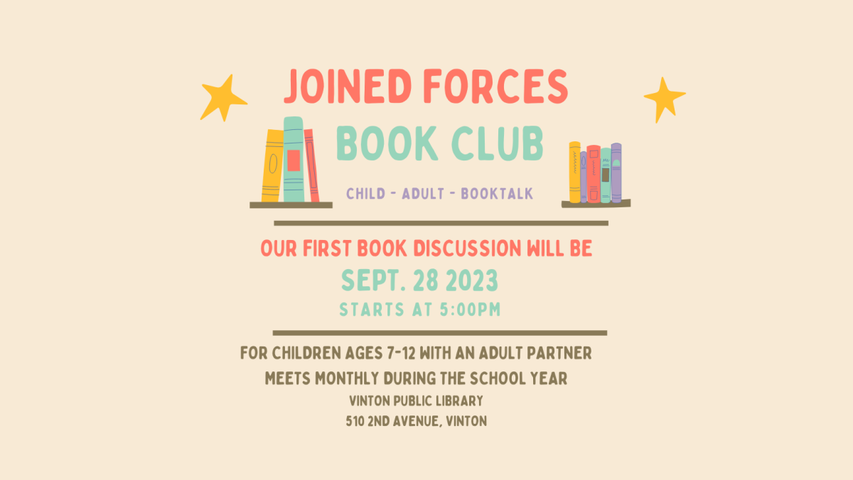 - Joined Forces Book Club: September 28, 5 pm; Kids ages 7-12 along with a special adult in their life (Mom, Dad, Grandma, etc.), read a book together, and come ready to discuss!