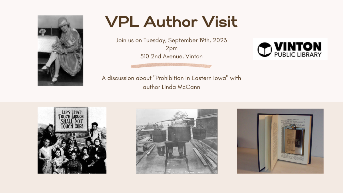- Author Visit September 19, 2 pm; Linda McCann speaks on her book ‘Prohibition in Eastern Iowa’