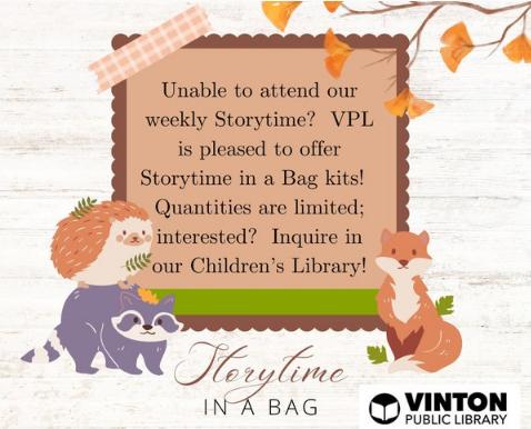 The Vinton Public Library is pleased to offer "Storytime in a Bag" kits! Check out a couple of fall themed books from our children's collection, and take home a kit with activities for you to enjoy with your child!
