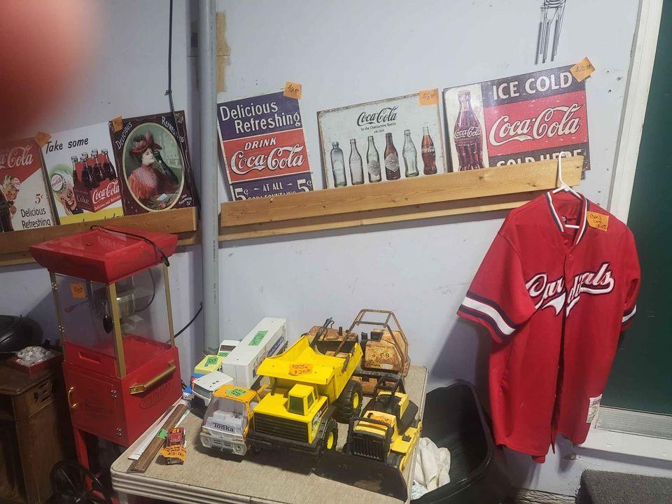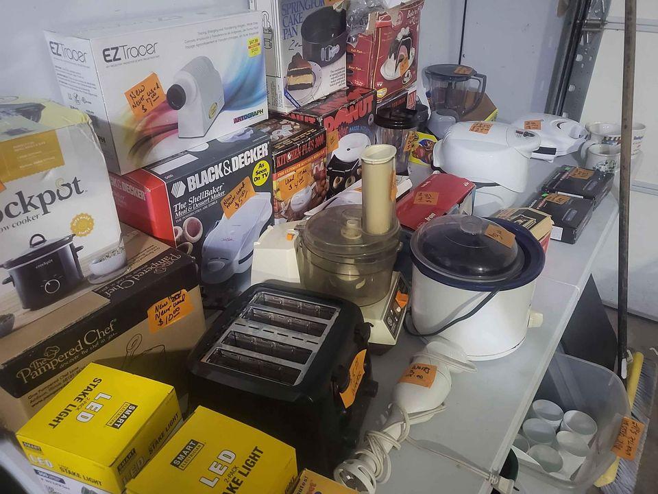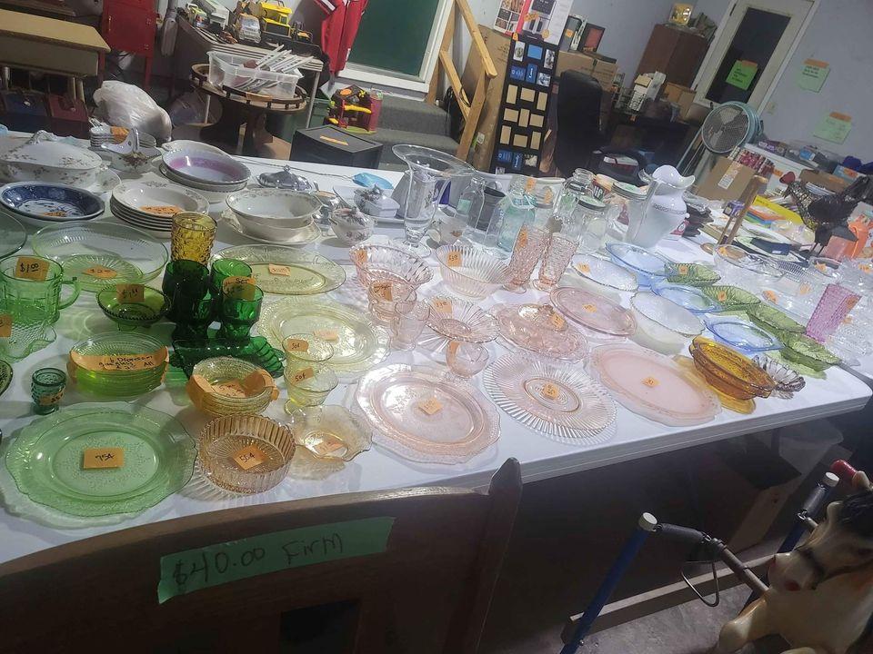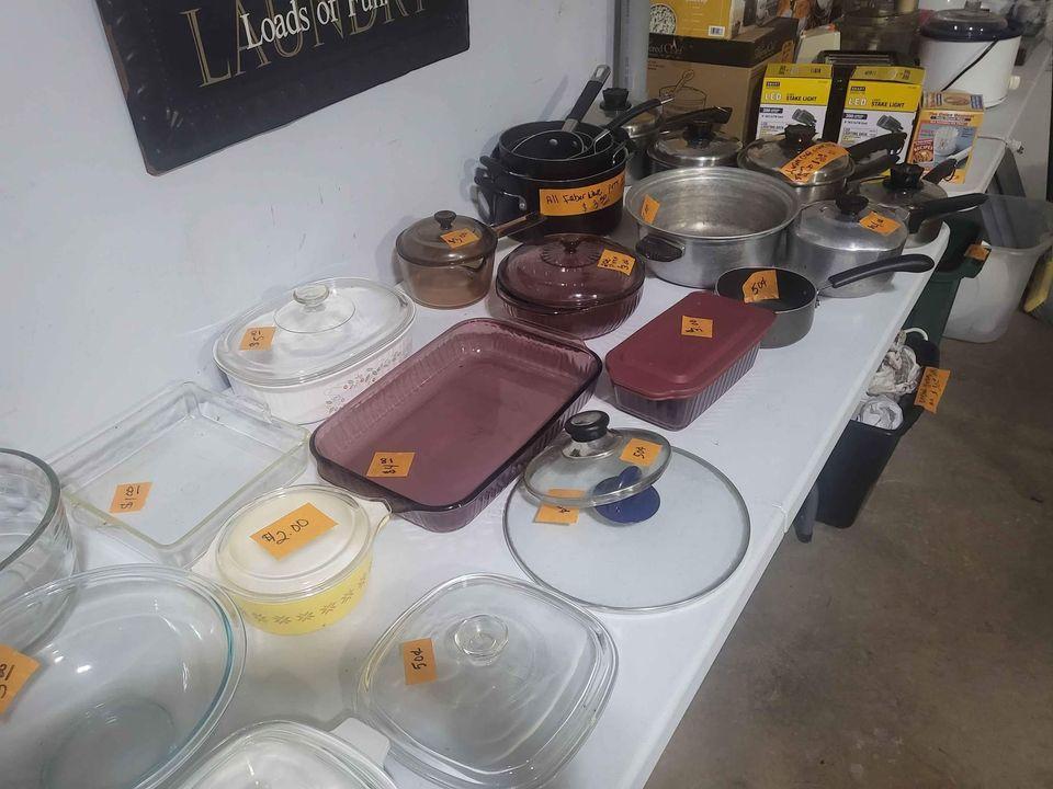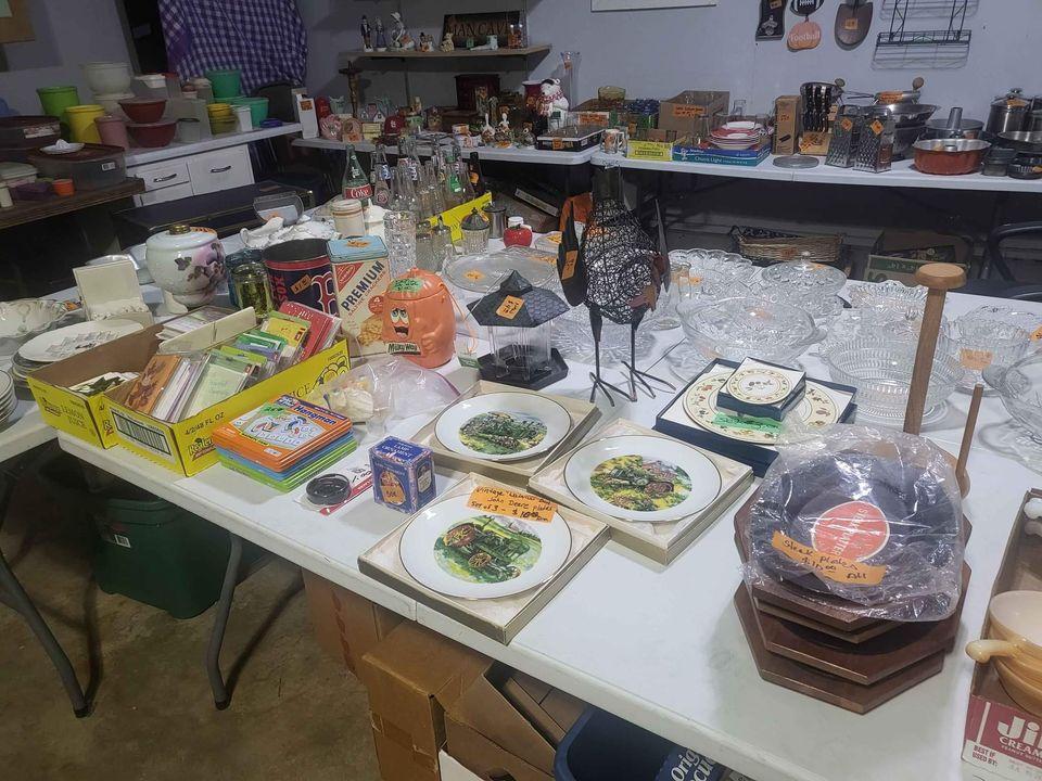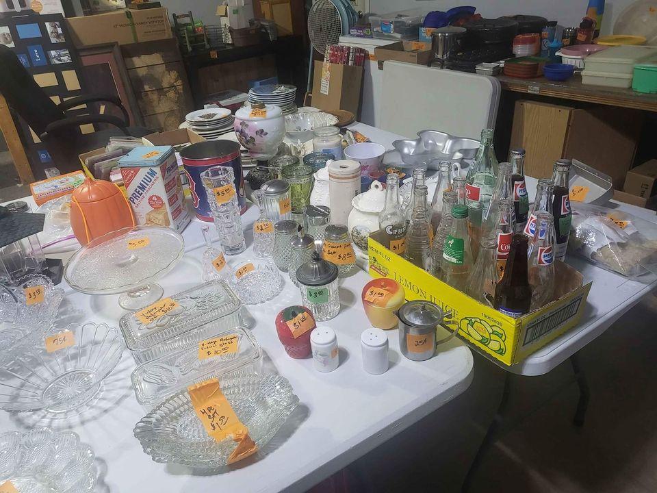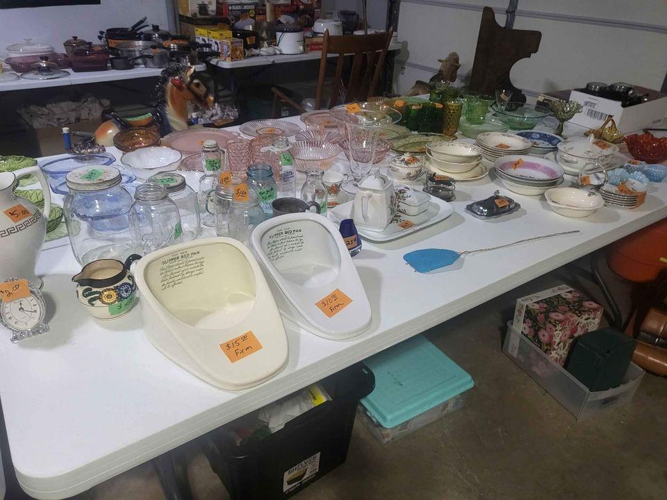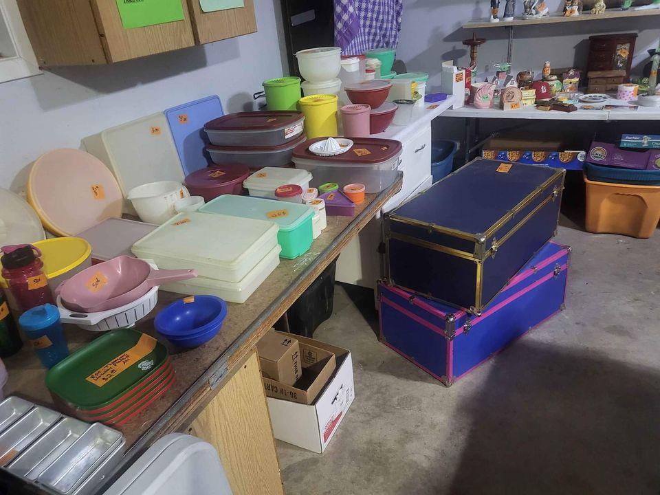 Lots of nice and vintage items. Some pink Depression glass, kitchen appliances, tupperware, Rubbermaid containers, rocking horses, cast iron, etc. Many things from a Texas estate.