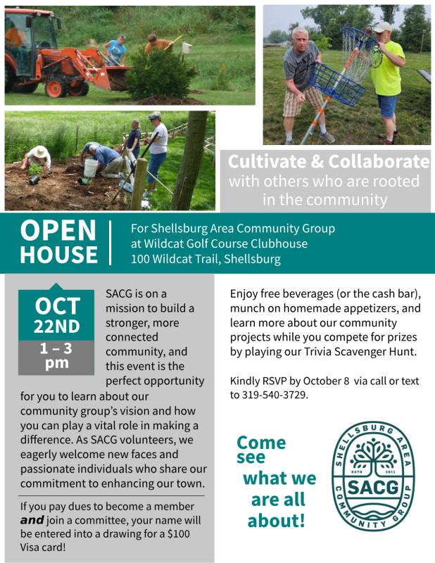 Shellsburg Area Community Group is having an open house! The group hopes you'll attend to learn more about the organization, have some fun participating for local gift certificates, socialize and enjoy some refreshments. The event will be upstairs at Wildcat from 1 to 3 on October 22nd, so feel free to stop by anytime during those hours. Please RSVP by call or text to Shelbie at 319-540-3729 so we have enough snacks for everyone.