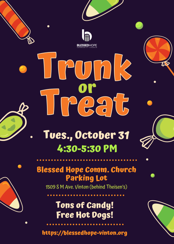 Blessed Hope Community Church, 1509 S. M Ave. Vinton, Trunk or Treat at Blessed Hope Decorated cars will be lined up in our church parking lot (1509 S M Ave.) Tons of candy - Free hot dogs, chips, & bottled water.