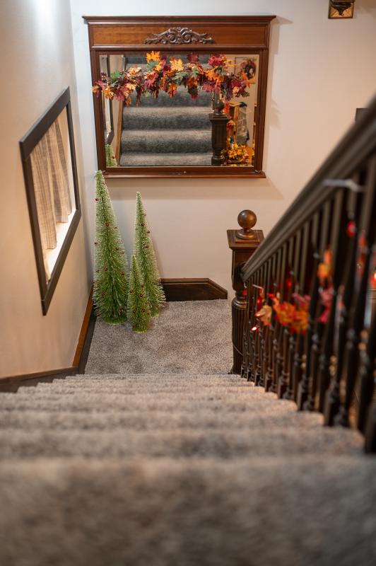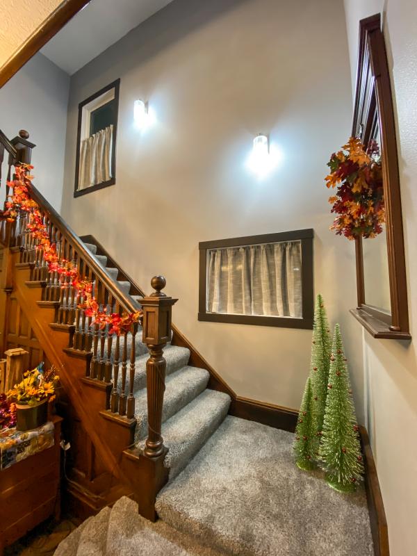 Ted & Robyn Oberhauser bought the house at 613 Commercial Street in 2020. The house had been divided into two apartments for many years and included a colony of bats living in it, unbeknownst to them when they bought it. During the remodel in 2022, they found the staircase was in great condition, so it was left untouched and looks to be original from the early 1900s. And they were able to convince the bats to find a new home. In the pictures, the staircase is still decorated as fall because the Oberhauser boys will not let Robyn decorate for Christmas until after Thanksgiving is over, but it will be decorated as Christmas for the Tour of Homes.