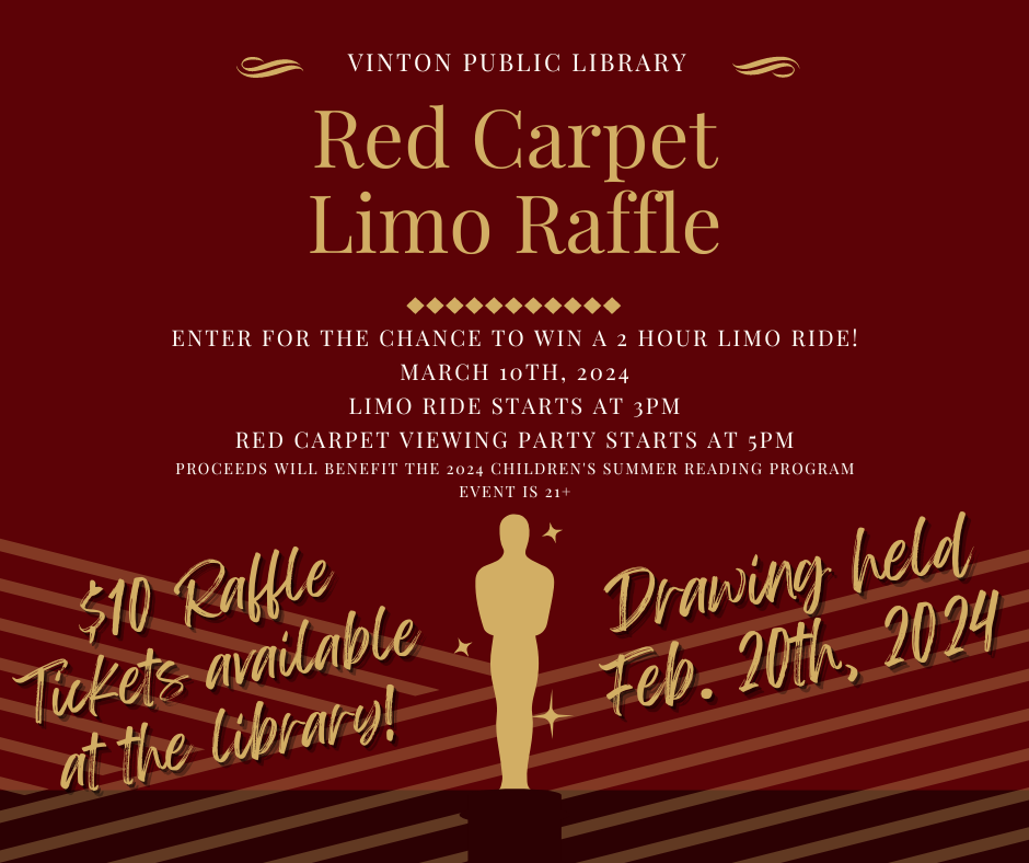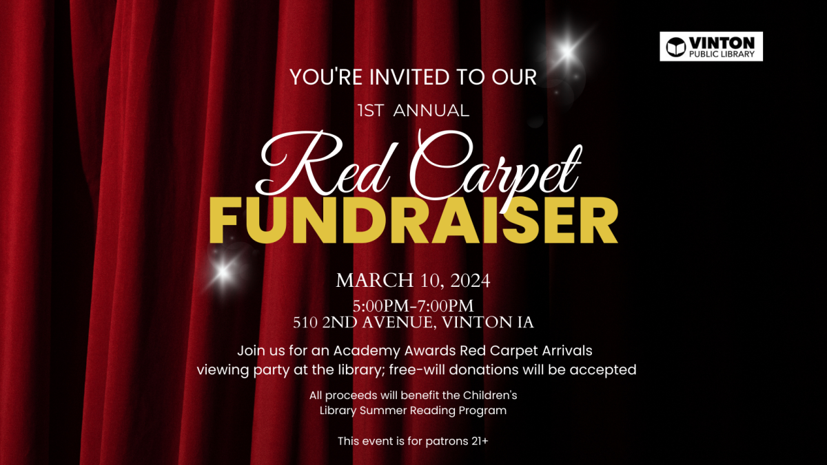 Join us Sunday, March 10th, 2024 at 5 pm for a Red Carpet Fundraiser at the Vinton Public Library! We will have drinks, appetizers, and movie trivia, along with 2 large screen TVs airing the Academy Awards Red Carpet Arrivals! The event is open to patrons 21+, and we will be accepting free-will donations. We are also selling raffle tickets for a 2-hour limo ride prior to the event, thanks in part to our sponsor Express Limousine Service of North Liberty. Raffle tickets are $10/each, and can be purchased at the library, or through Eventbrite. All proceeds from this fundraiser will benefit the 2024 Children’s Summer Reading Program. Semi-formal dress is encouraged, but not required.