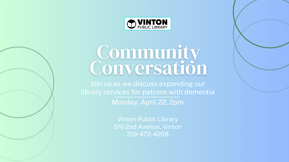Join us at the Vinton Public Library for a Community Conversation as we discuss expanding our library services for patrons with dementia.