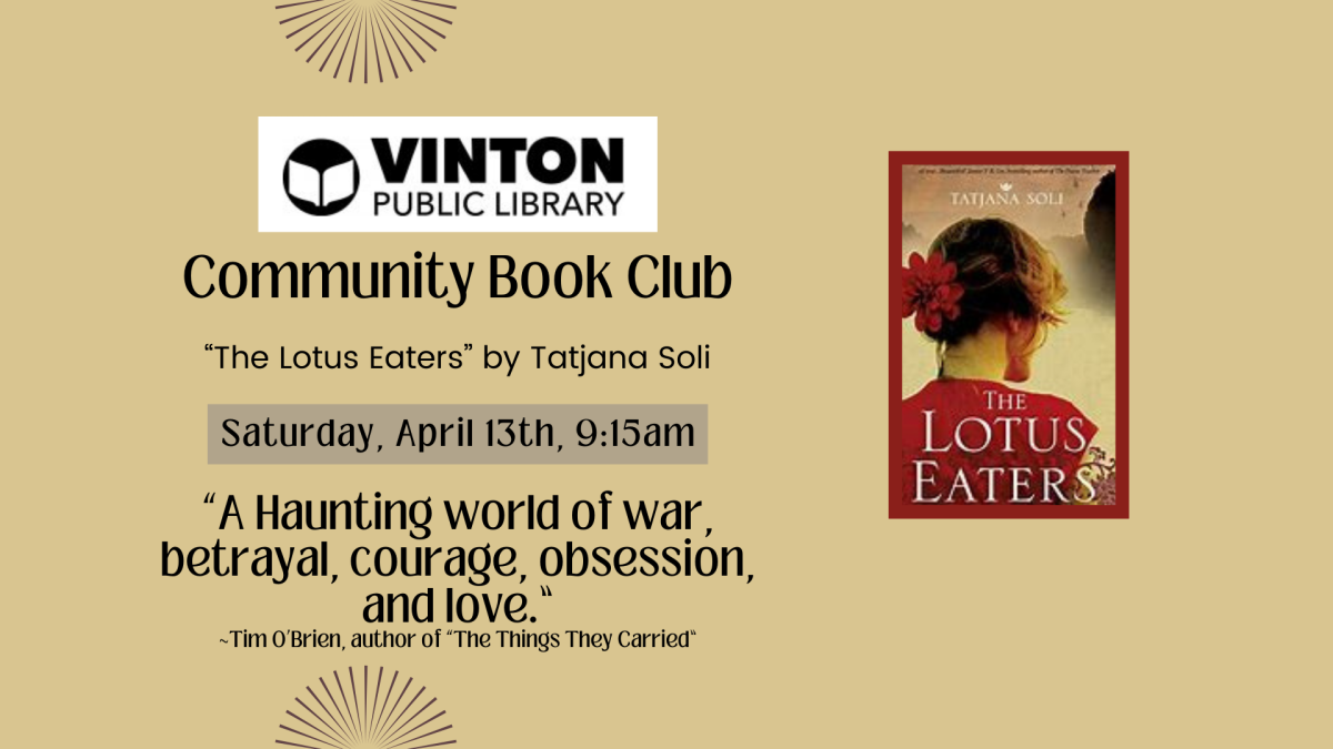 The Community Book Club will be held at the Vinton Public Library on April 13th at 9:15 a.m. The library is located at 510 2nd Ave. in Vinton. For questions, you can call 319-472-4208.